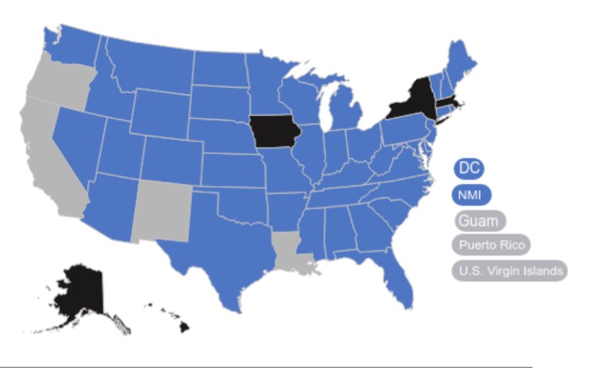 Alabama, Arizona, Arkansas, Colorado, Connecticut, Commonwealth of the Northern Mariana Islands, Delaware, District of Columbia, Florida, Georgia, Idaho, Illinois, Indiana, Kansas, Kentucky, Maine, Maryland, Michigan, Minnesota, Mississippi, Missouri, Montana, Nebraska, Nevada, New Hampshire, New Jersey, North Carolina, North Dakota, Ohio, Oklahoma, Pennsylvania, Rhode Island, South Carolina, South Dakota, Tennessee, Texas, Utah, Vermont, Virginia, Washington, West Virginia, Wisconsin, & Wyoming.